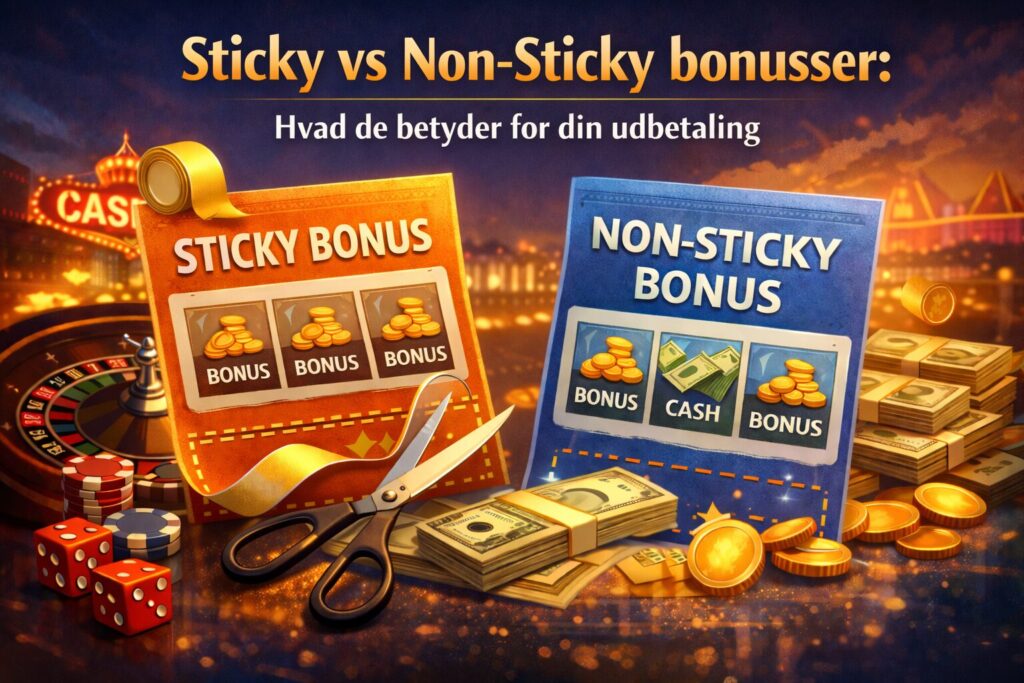 “Sticky” og “Non-Sticky” er to af de mest misforståede bonusbegreber i online casino-vilkår. De lyder tekniske, men det vigtigste spørgsmål er enkelt: hvad kan du faktisk få udbetalt, og hvornår? En sticky bonus er som regel bundet til casinoet og kan ikke i sig selv hæves som kontanter. En non-sticky bonus er normalt mere fleksibel, men det betyder ikke, at hele saldoen pludselig er frit tilgængelig. Omsætningskrav, spilbidrag, tidsfrister, max indsats, udelukkede spil og nogle gange max udbetaling spiller stadig ind. Denne guide forklarer, hvordan begge modeller typisk fungerer, hvordan de påvirker din udbetaling, hvad der sker ved tidlig udbetaling, og hvilke bonusvilkår du bør læse først.
